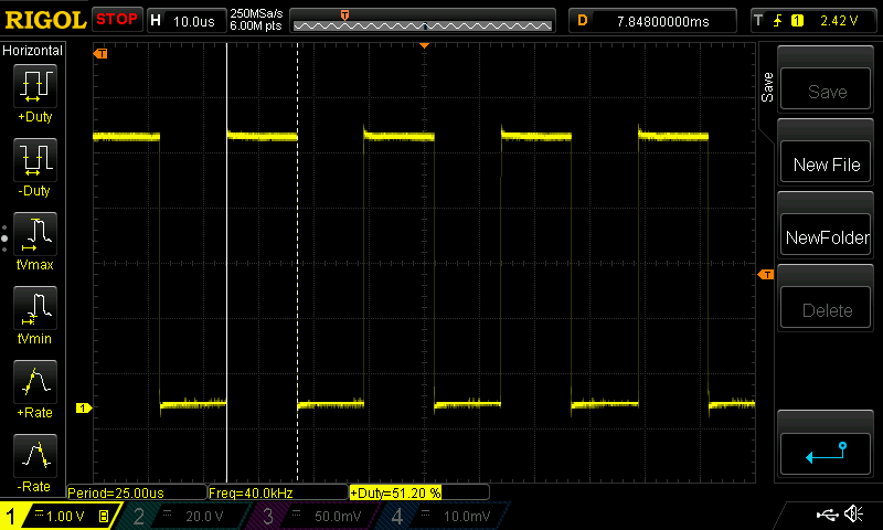 Below we present a selection of oscilloscope images, showing the various carrier frequencies and duty-cycles.