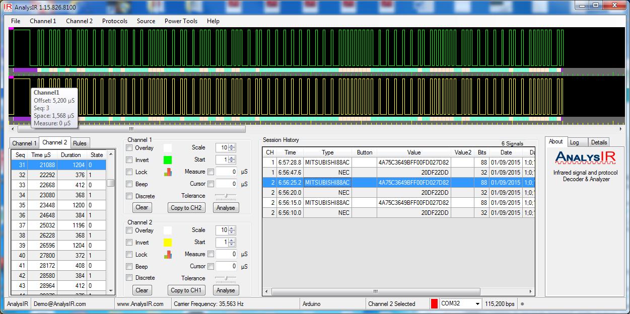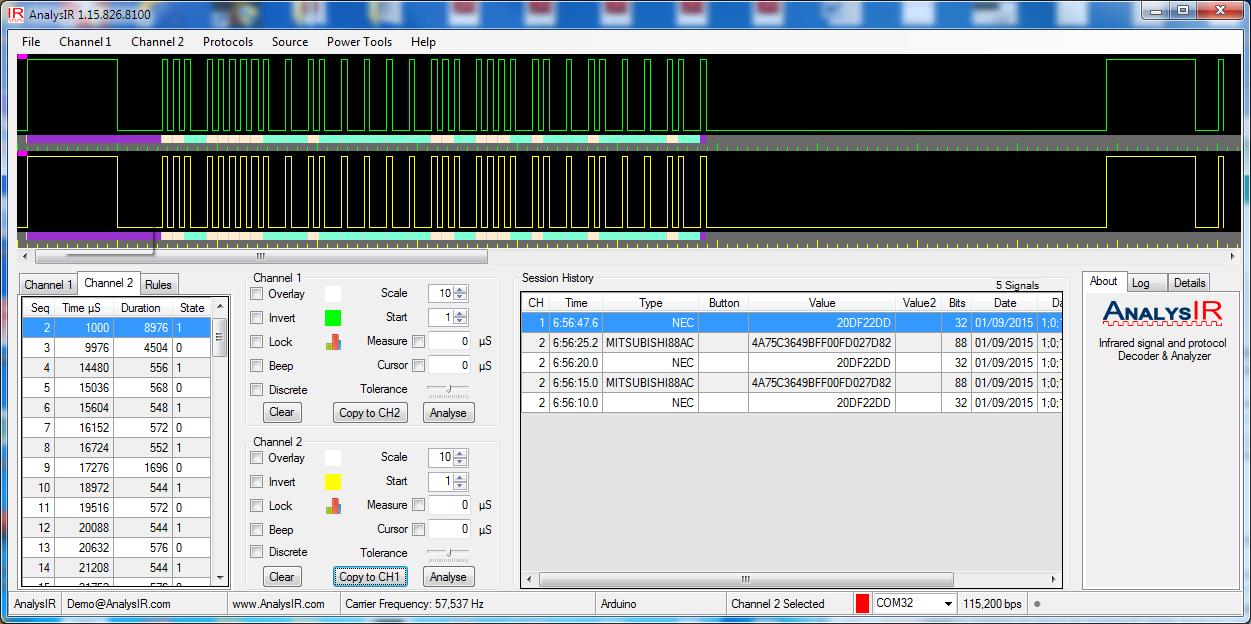 - The Hex representation of the signal (32-bit), which can be obtained from AnalysIR or other libraries.