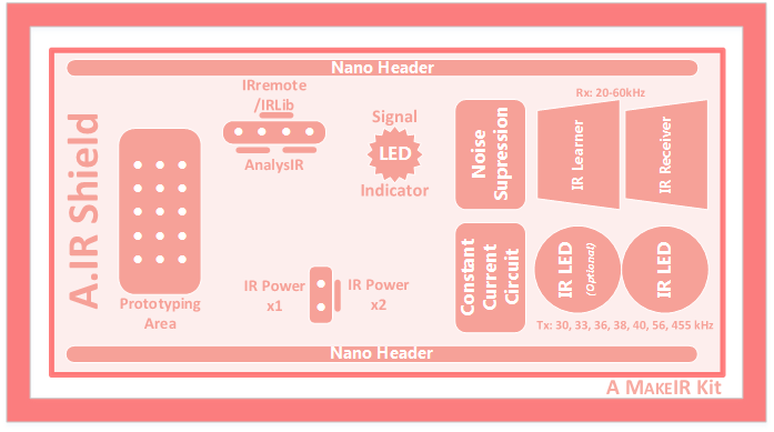 The fifth member of our MakeIR series of devices & kits is the A.IR Shield Nano. This shield works out of the box with AnalysIR and is essentially plug & play , with additional prototyping options. The shield comes attached to an Arduino nano compatible device (clone). Although designed specifically for AnalysIR, users can also upload IRremote, IRLib or any Arduino sketches that run on the Nano. A.IR shield is built with only the highest quality IR components available and boasts dual Infrared emitters with configurable IR Power.