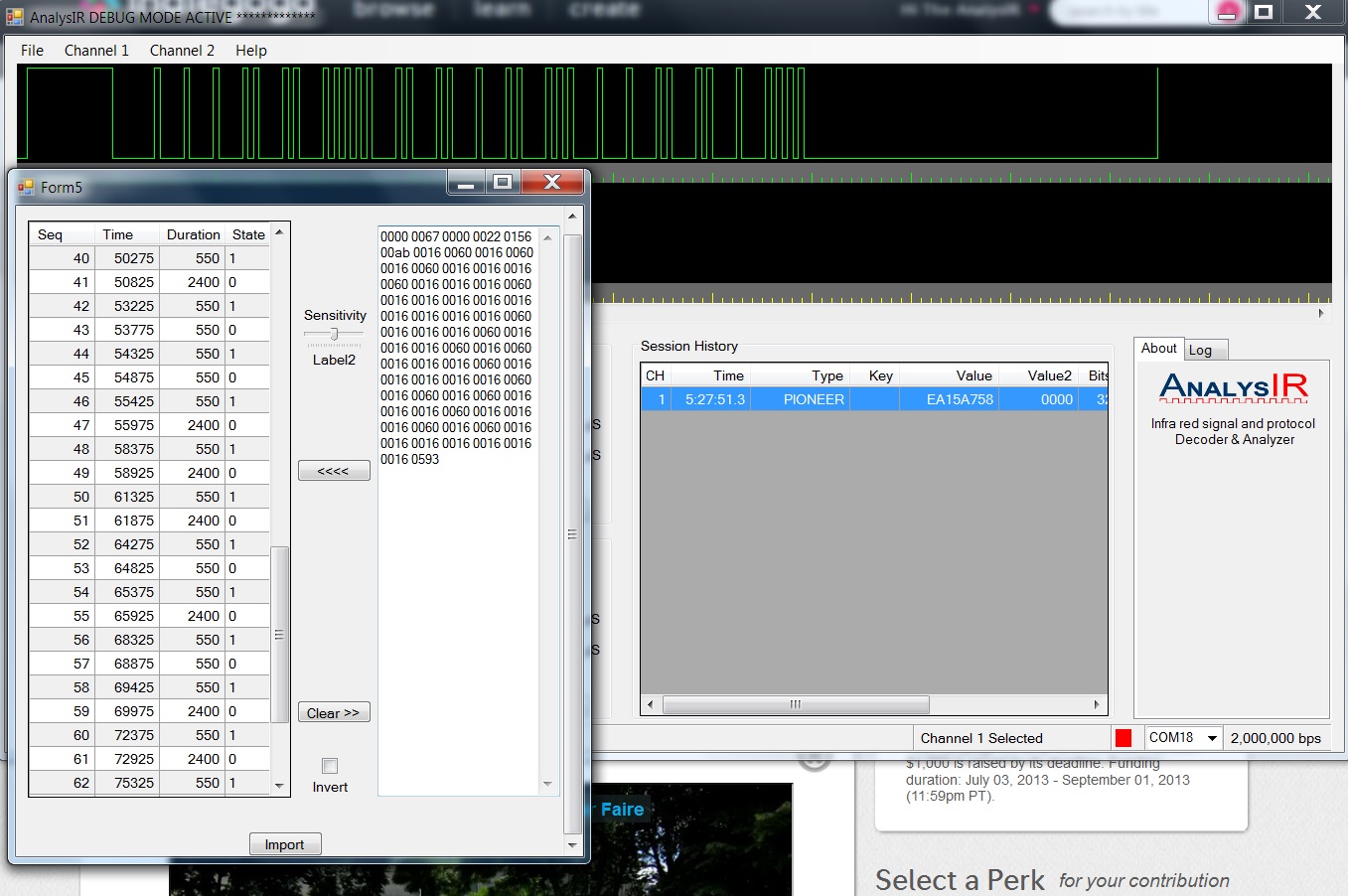 2: We wanted to update everyone on our progress with export in Global Caché command format. Well after some initial mistakes using IRremote to generate the signals for a SKY HD remote, we finally succeeded in verifying that the export works with GC equipment, with the help of one of our backers, who happens to have this equipment installed. (Unfortunately, we didn’t have a SKY remote control available)